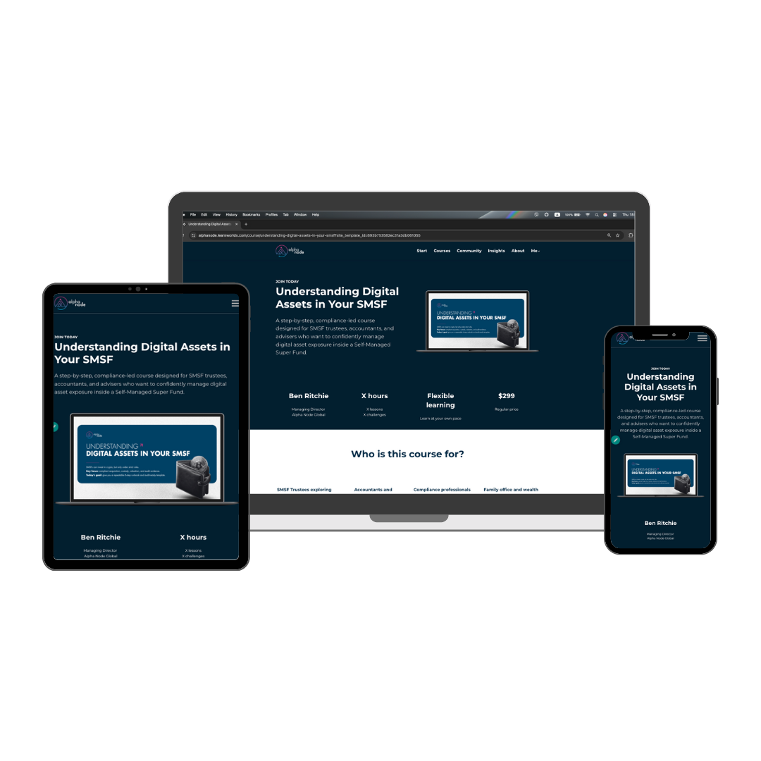Alpha Node Academy for Investors is designed to give wholesale investors, SMSF trustees, and professionals the knowledge, frameworks, and governance required to engage with digital assets responsibly and confidently.